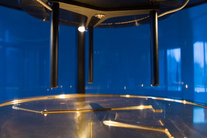 Nepřehlédnutelná zlatá mince s logem Akademie věd ČR vznášející se ve vzduchu demonstruje princip dočasného ukládání elektrické energie do energie otáčivého pohybu setrvačníku. Ten má v tomto případě podobu mince. Aby se otáčení setrvačníku nezastavilo mechanickým třením, které vzniká v běžných kluzných nebo kuličkových ložiscích, je setrvačník (mince) uložen na magnetickém závěsu a využívá hned několik magnetů a elektromagnet.