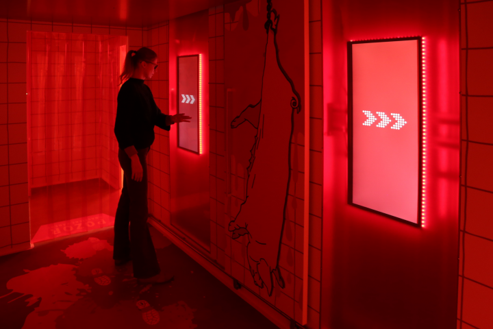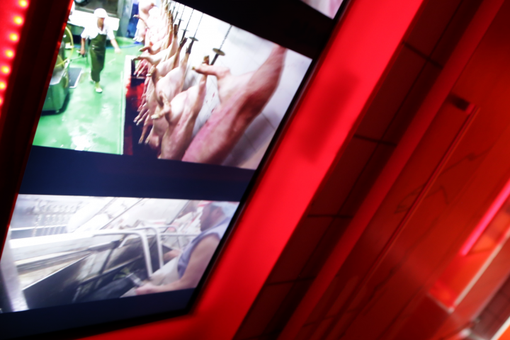 Návštěvník vstoupí do zastíněné chodby. Uchopí zavěšeného čuníka na závěsu a postupně ho tlačí do třech pozic. V každé pozici shlédne obrazovku s porážkami třech různými zvířat. Jakmile návštěvník prase pustí, gravitací opět sjede do výchozí pozice a exponát je opět přístupný pro další skupinu.